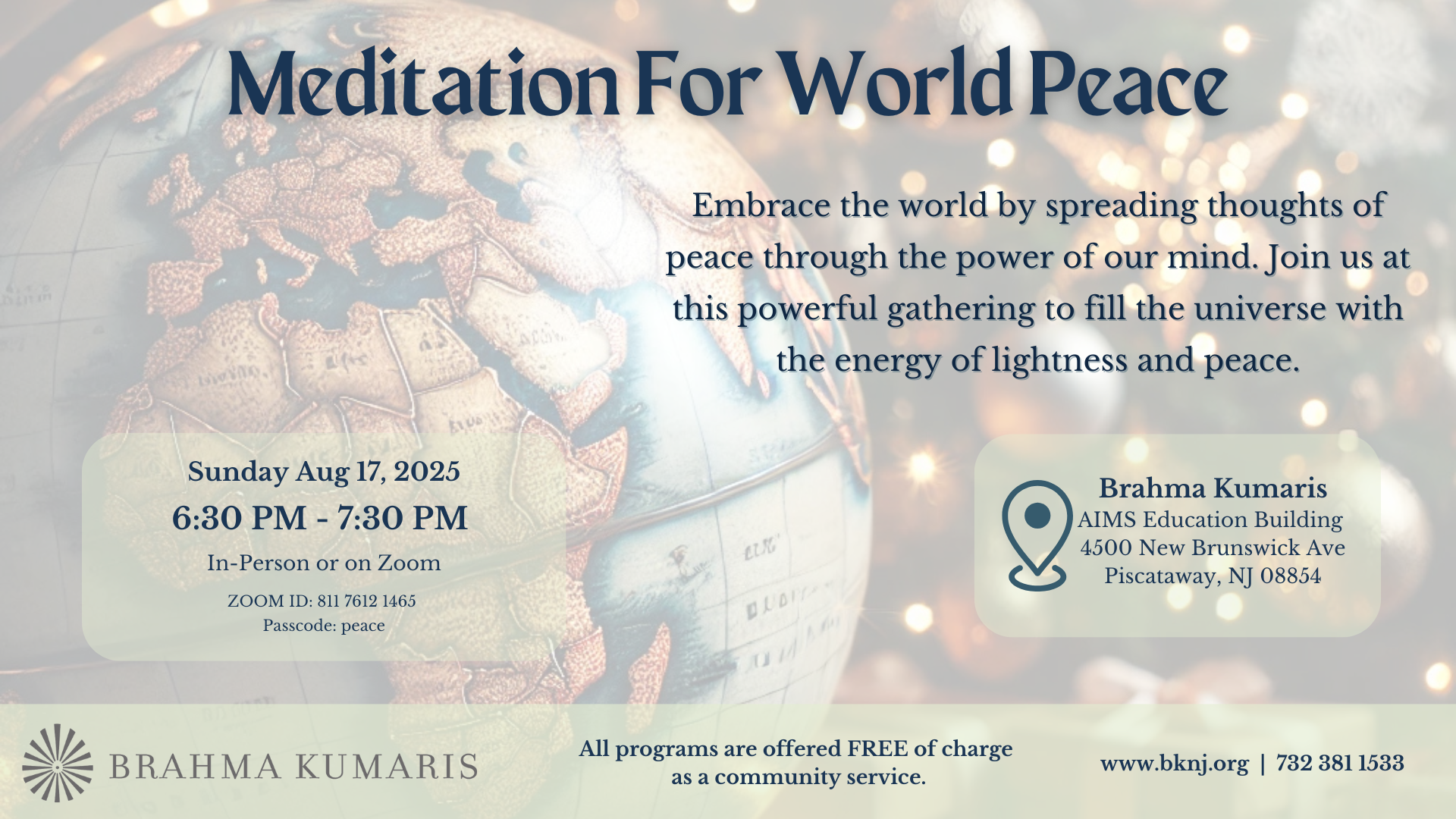 Embrace the world by spreading thoughts of peace through the power of our mind. Join us at this powerful gathering to fill the universe with the energy of lightness and peace.