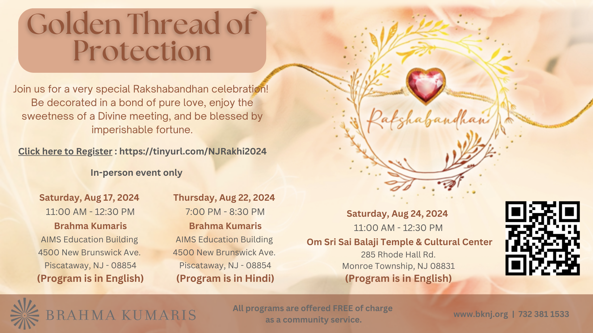 Join us for a very special Rakshabandhan celebration! Be decorated in a bond of pure love, enjoy the sweetness of a Divine meeting, and be blessed by imperishable fortune.