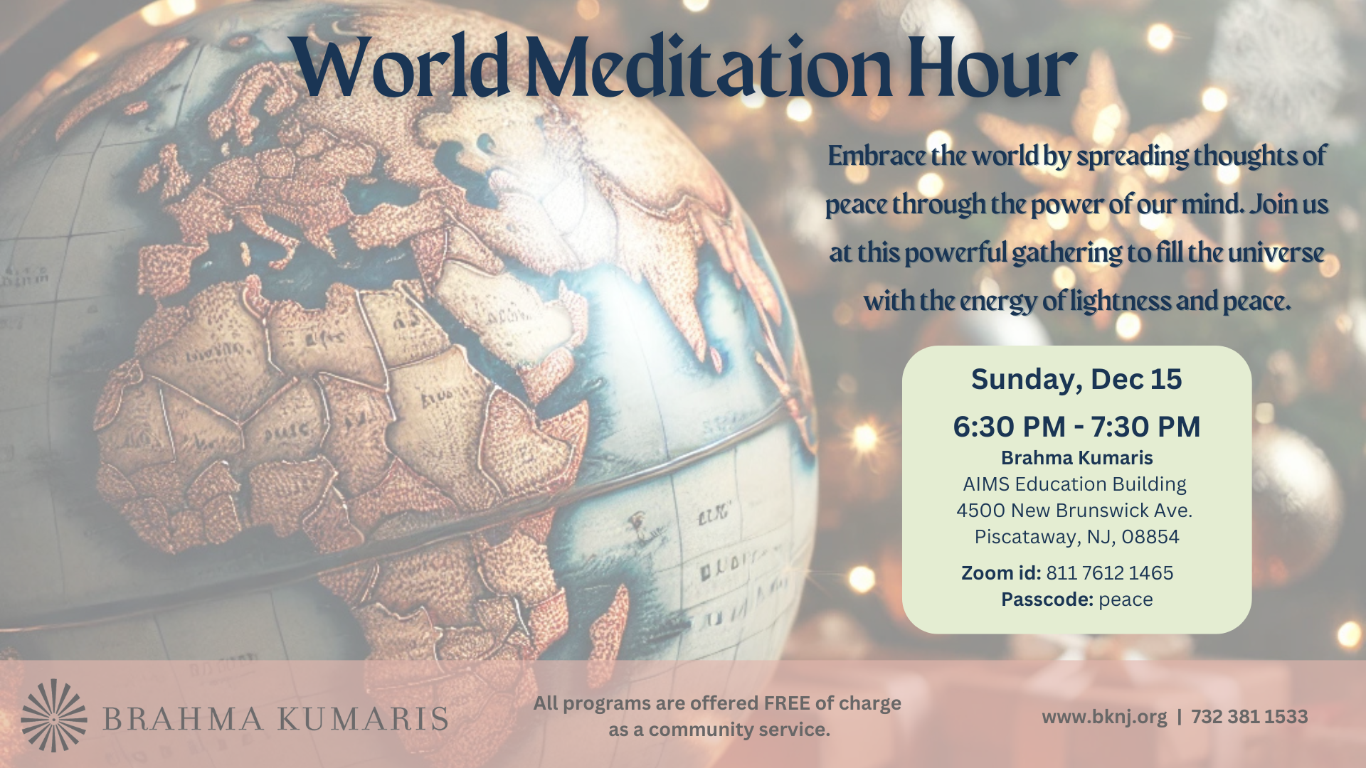 Embrace the world by spreading thoughts of peace through the power of our mind. Join us at this powerful gathering to fill the universe with the energy of lightness and …